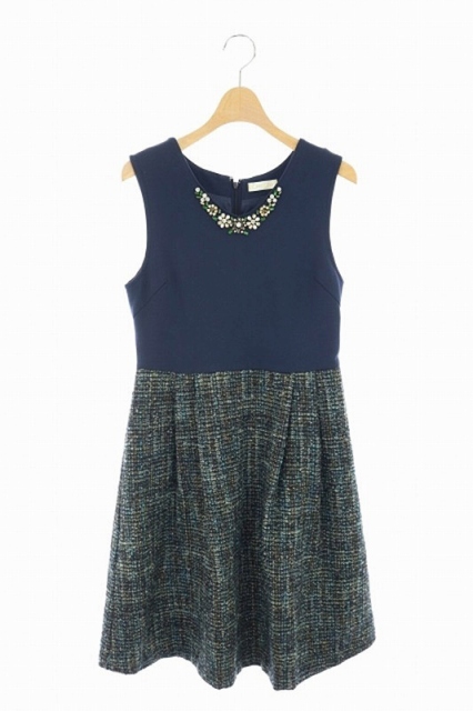 チェリーアン Cherry Ann ノースリーブワンピース ビジュー装飾 切替 ひざ丈 ツイード Vネック F 青 紺 Rm Os レディース 170 ベクトルパーク
